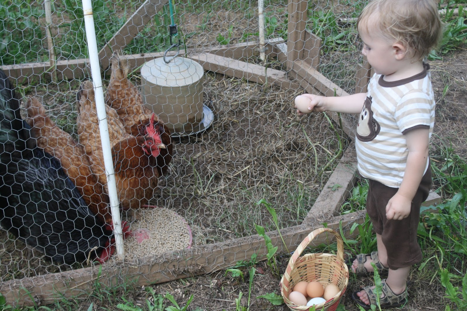 Alfie just adores the chickens and never misses out on the chance to toss them a little food or collect the eggs.